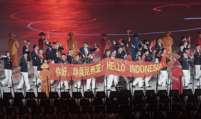 1. 1. Kontingen China Bawa Spanduk Raksasa Bertuliskan "Hello Indonesia"