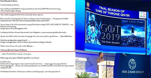 Pidatonya ini mendapat dua kali standing applause dari hadirin. Warganet lalu terinspirasi dan membuat beberapa editan momen Jokowi pidato 'Game Of Thrones'. Berikut beberapa kreasi unik dilansir dari berbagai sumber, Jumat (12/10).