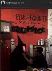 Mengenakan kaos hitam dirinya membantu Sean memasang sticker di sebuah ruangan sekaligus meberikan ide riasan helloween untuk anaknya.