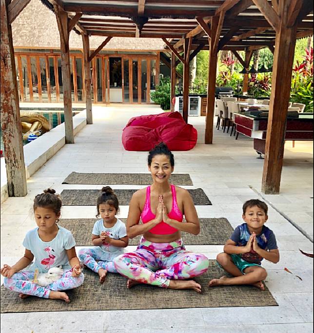 Ia juga mengajak ketiga anaknya untuk ikut serta latihan yoga bersamanya.