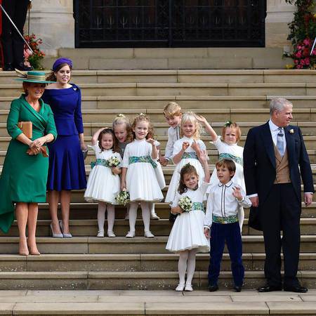 Bridesmaid cilik alias flower girl mengenakan rok putih, sabuk hijau biru, stoking putih dan sepatu putih. Rambut mereka dihias denan aksesoris berbentuk daaun. Nampaknya ini untuk mengimbangi tiara emerald yang dikenakan Putri Eugenie.