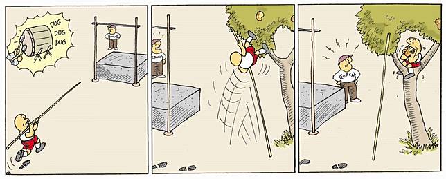 Sebuah karakter kocak yang digambarkan berkepala pelontos dan menggemari olahraga ini kerap hadir dalam bentuk komik strip lho. Kisahnya selalu kocak dan sukses bikin pembacanya ketawa riang.