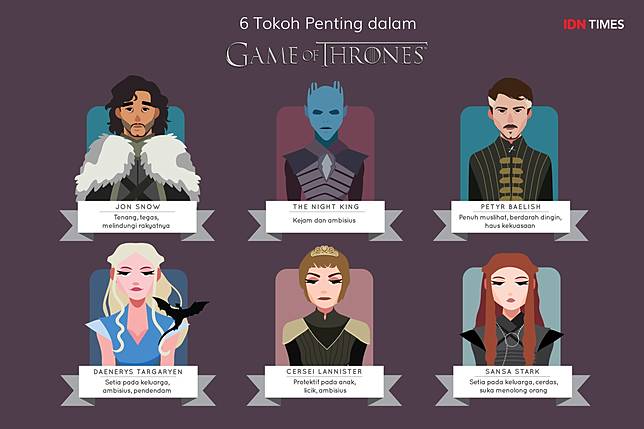 Kira-kira itulah enam karakter pemimpin yang menjadi sorotan penonton setia Game of Thrones. Nah, seandainya Jokowi adalah salah satu pemerannya, siapakah karakter yang cocok untuk Presiden Jokowi menurut kamu guys?