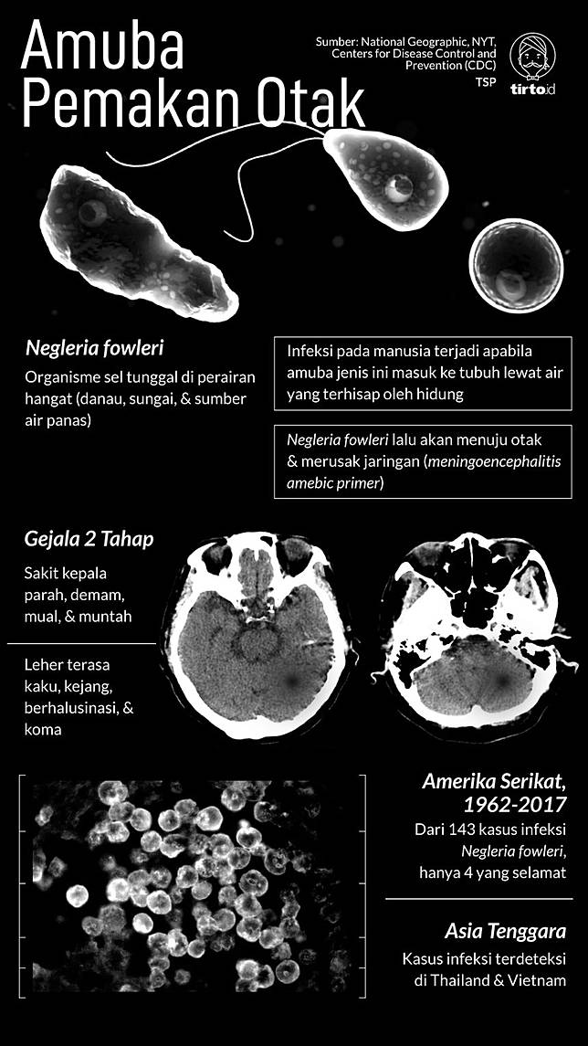 Dilansir situs CDC, Naegleria fowleri merupakan organisme bersel satu yang hidup di perairan hangat seperti danau, sungai, dan sumber air panas serta tanah. Hany Elsheikha, associate professor Parasitologi University of Nottingham, mengatakan bahwa parasit ini dapat menyebabkan peradangan otak parah yang disebut denganmeningoencephalitis amebic primer. Karena organisme ini mampu menghancurkan jaringan otak, ia lantas dijuluki sebagai amuba pemakan otak.