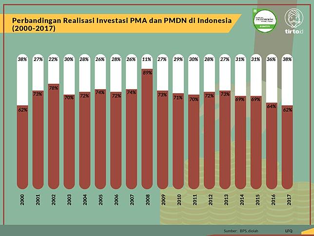 Dampaknya, realisasi PMA yang masuk ke Indonesia pada tahun itu melambung tinggi menjadi Rp162,84 triliun. Jumlah tersebut menyumbang porsi 88,89 persen dari total nilai realisasi investasi pada tahun tersebut. Sementara, PMDN hanya mengumpulkan investasi sebesar Rp20,36 triliun.