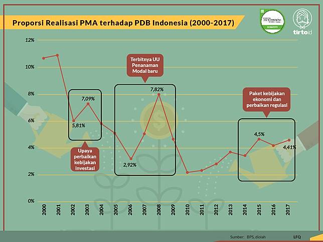 Selain porsi PMA yang mengecil terhadap PMDN, porsi realisasi PMA juga mengecil terhadap produk domestik bruto (PDB) atau perekonomian. Porsi PMA terhadap PDB pada 2017 hanya 4,41 persen, turun dari 2015 yang sempat 4,5 persen. Namun, secara historis total nilai realisasi PMA di Indonesia memang dalam tren mengalami kenaikan. Realisasi PMA tak terpisahkan dari kondisi dan kebijakan yang diterapkan oleh pemerintah yang berkuasa.