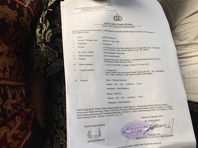 Laporan itu sudah diterima Bareskrim dengan nomor surat STTL/1009/X/2018/BARESKRIM berdasarkan Undang-Undang No. 1 Tahun 1946 Pasal 14, Pasal 15 dan Undang-Undang ITE Pasal 28 (2) tentang ujaran kebencian, penyebaran berita bohong (hoaks).