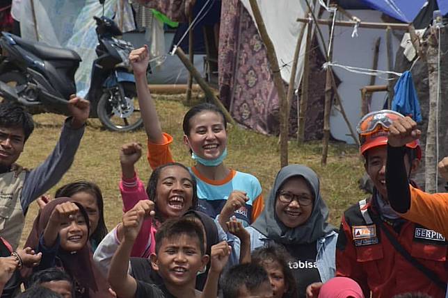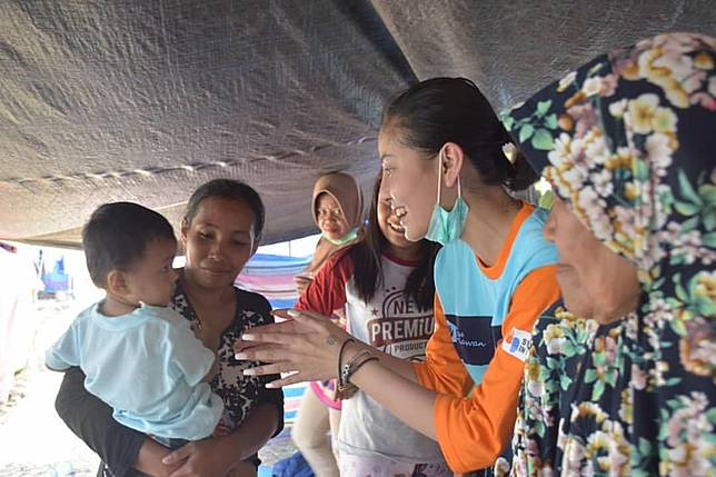 4. Ekspresi Karin saat mengunjungi korban di pengungsian, haru banget