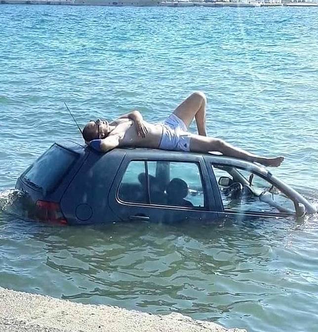 8. Mobilnya tenggelam dia malah nyantai aja.