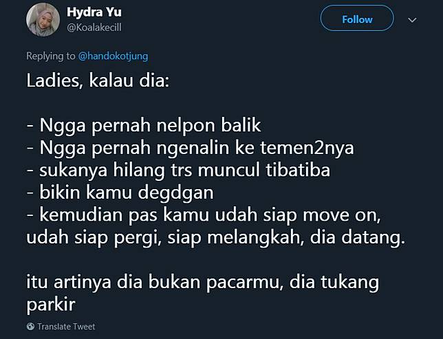 7. Benar juga. Kalau dia sering ngilang dan muncul secara tiba-tiba mirip tukang parkir ya.