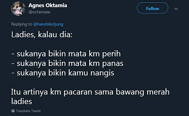 5. Nah, kalau selama ini pasanganmu doyan bikin kamu nangis, mungkin selama ini kamu pacaran dengan bawang merah.
