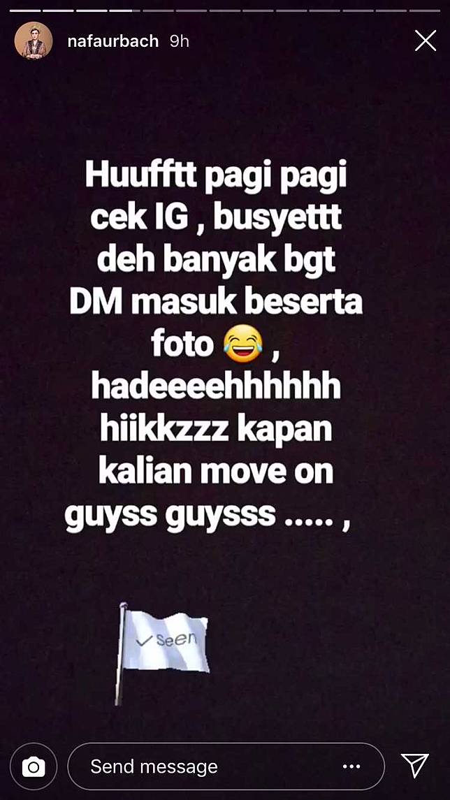 “Huufftt pagi pagi cek IG busyettt deh banyak bgt DM masuk beserta foto, hadeeeehhhhh hiikkzzz kapan kalian move on guyss guysss…,” pungkas Nafa Urbach.