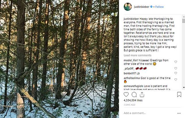 "Selamat merayakan Thanksgiving semuanya, maaf terlambat. Ini merupakan Thanksgiving pertamaku sebagai seorang pria yang telah menikah, pertama kali menjadi host acara. Pertama kali dimana dua keluarga berkumpul bersama. Hubungan itu adalah hal yang sulit, dan cinta bukanlah hal yang mudah, tapi aku merasa bersyukur kepada Tuhan yang telah menunjukkan bagaimana cara mengatasinya," tulisnya.