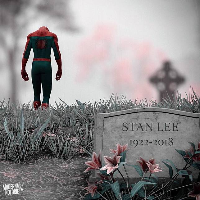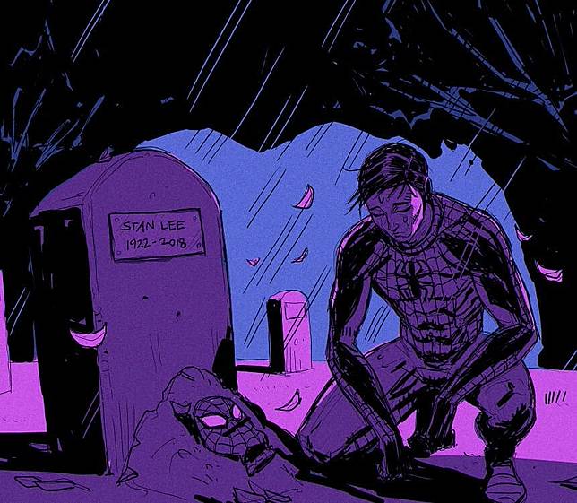 Karya dari modernnotoriety ini nggak kalah bikin sedih. Dalam gambar ini ada nisan yang bertuliskan naman "Stan Lee" dan ada sosok Spiderman yang menunduk sedih meninggalkan nisan itu. Buat yang belom tahu nih, Spider-Man adalah karakter favorit Stan Lee loh. Selain itu ada satu lagi cerita yang nggak kalah menarik. Dulu, mesin ketik yang dipakai buat nulis beberapa karakter pertama ciptaan Stan Lee termasuk Spider-Man dirusak oleh istrinya saat mereka lagi berantem.
