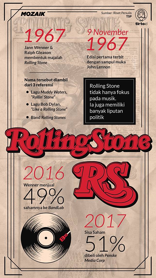 Wenner beserta kawan baiknya, Ralph J. Gleason, lantas kepikiran untuk membentuk media populer. Membahas musik, tapi juga bicara soal politik. Apalagi di dekade 1960-an, politik adalah barang penting dan dibicarakan di mana-mana.
