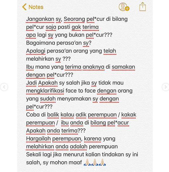 "Bagaimana perasaan sy? Apalagi perasaan orang yang telah melahirkan sy? Ibu mana yang terima anaknya disamakan dengan pel*cur??? Jadi apakah sy salah jika sy tidak mau mengklarifikasi face to face dengan orang yang sudah menyamankan saya dengan pel*cur??," tulis Via Vallen.